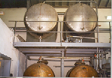 Photo 21: The oil-bearing water from the first distillation (of the Rose blossoms) is pumped into these large tanks to be held until it goes through the second distillation (cohobation). The cohobation is performed in a separate still maintained for that purpose only. Contrary to what we read in some books, the oil-bearing waters ARE NOT recycled through the spent Rose blossoms. There would be no purpose in doing this as the Rose blossoms have given up all the oil they will give during the initial distillation. The cohobation is only to extract the lion's share (around 80%) of the remaining Rose oil from the oil-bearing water. Photo 22: Rose oil extracted from the second distillation (cobation) of the oil-bearing waters is called "Second, Indirect and/or Recovered Oil." I prefer to call it Liquid Gold! In this photo, the golden colored liquid at the top of the Florentine Flask (cylinder) is Rose oil - that underneath is oil-bearing water - it is the Rose Hydrosol. There's a dump valve in the center of the Flask - when the level of Rose oil rises to the top of the valve, it spills over and escapes through this tube/valve into a glass holding bottle. A small amount of the water will also escape. The master distiller (Usta) will later remove that water using a hose and suction - like siphoning gasoline from your car. After blending of the first and second oils, the final product, the Anatolian Rose Otto, is packed in tinned steel containers called "Kumkuma" - these containers look like US Civil War canteens. They are the containers that those of you who have purchased Turkish Rose Otto in bulk have fought to open - until you figured out that it was a very easy task .. ;-) |